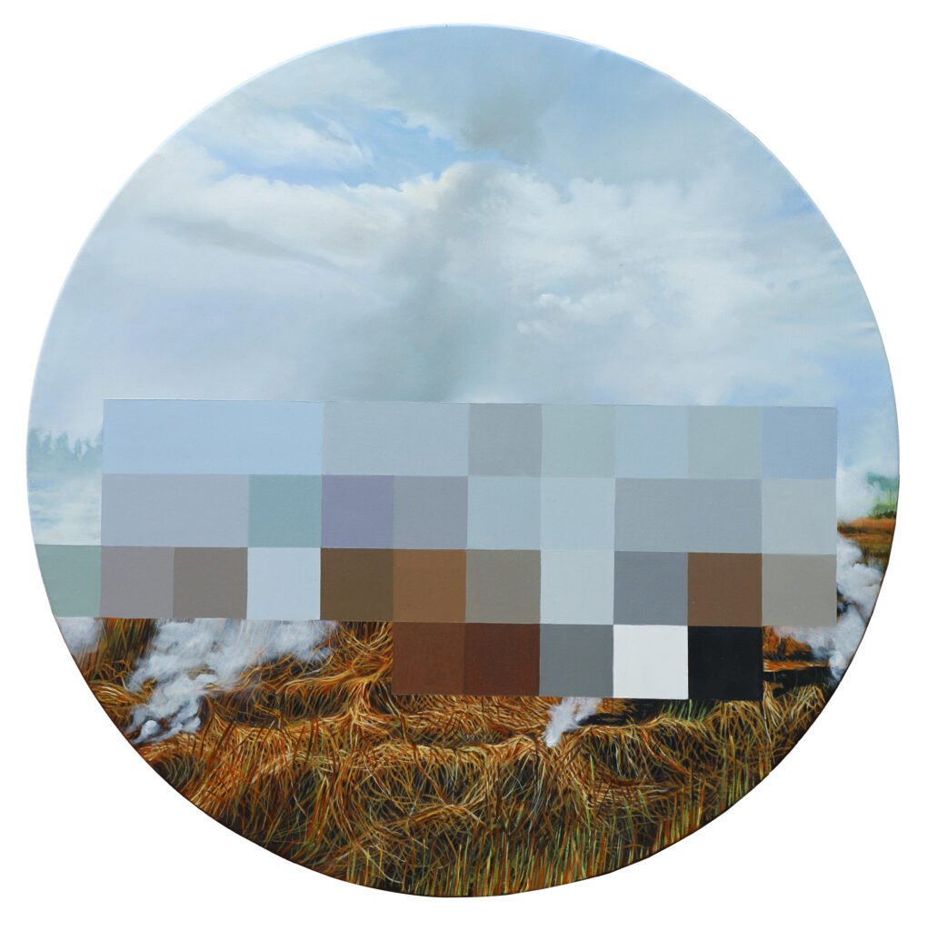 Smoking Gaze is a new series of five oil-on-canvas works that confronts stubble burning as one of the most argued and most politicised points in the ongoing debates around farming in India. Cast repeatedly in public discourse as the singular cause of ecological damage and urban pollution, stubble burning has become a smokescreen, narrowing complex agrarian realities into a spectacle of blame.